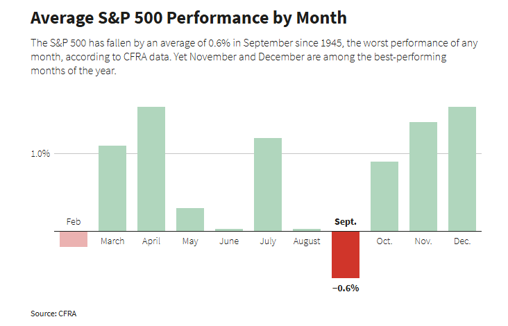 En tout cas, il est historiquement le mois qui abîme la performance de Wall Street, comme en témoigne cette étude de CFRA indiquant que le S&P 500 affiche en moyenne une performance négative de –0,6 % en septembre depuis 1945, le pire résultat mensuel de l’année.