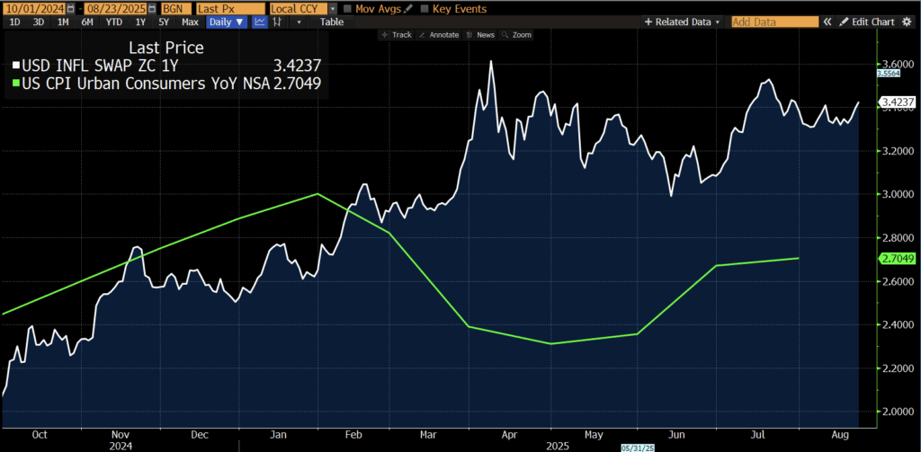 Pour rappel, un SWAP est un contrat financier entre deux parties qui échangent des flux de paiements. Dans le cas d’un swap d’inflation (CPI swap), une partie paie un taux fixe d’inflation prévu, l’autre paie l’inflation réelle observée. Parce que beaucoup d’investisseurs utilisent ces swaps, le prix auquel ils s’échangent devient une mesure de ce que le marché anticipe pour l’avenir. Voilà une semaine, le SWAP d’inflation à un an pour les Etats-Unis s’établissait à 3,42 %.