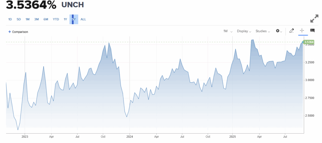Et si l’on en croit le rapport sur les revenus des ménages de vendredi qui a montré une forte hausse des dépenses de consommation (+0,5 %) et une augmentation solide du revenu personnel (+0,4 %), menée par une progression substantielle des salaires et traitements privés (+0,7 %), ladite inflation a peu de chances de rentrer dans son terrier ces prochains mois… surtout lorsque le ralentissement de l’économie américaine est comme la baisse de la dépense publique chez nous : il se fait attendre. Le modèle GDPNow de la Fed d’Atlanta a estimé la croissance du PIB réel du T3 à 3,5 %, contre 2,2 % auparavant.