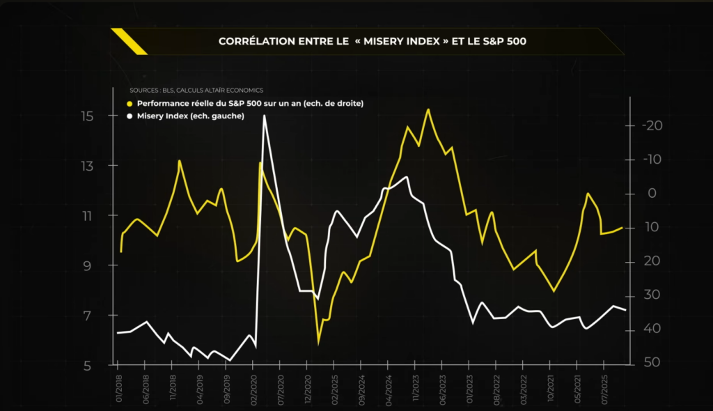 Vincent Bezault : Christian Parisot, nous allons parler aujourd’hui d’un indicateur bien connu des économistes, longtemps utilisé pour anticiper les performances boursières américaines, mais qui a perdu en efficacité en 2025. Il s’agit du Misery Index. Avant d’analyser son éventuel retour en grâce, pouvez-vous rappeler précisément ce qu’est cet indicateur ?