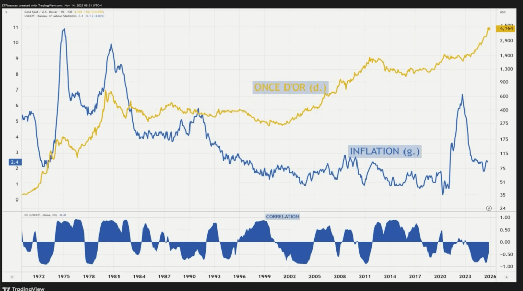 Régis Yankovici : Exactement. Depuis 2018, la corrélation est globalement négative : l’or a monté alors que l’inflation retombait. On pourrait presque dire que l’or protège de la désinflation, ce qui est un contresens par rapport aux discours traditionnels.