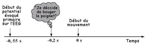 En ce qui concerne l’expérience, l’EEG des participants a indiqué qu’à 550 ms avant le mouvement du poignet, un potentiel de préparation apparaît dans le cerveau. A 200 ms, donc 350 ms plus tard, le participant prend conscience de son intention. Et à 0 ms, l’action est exécutée.